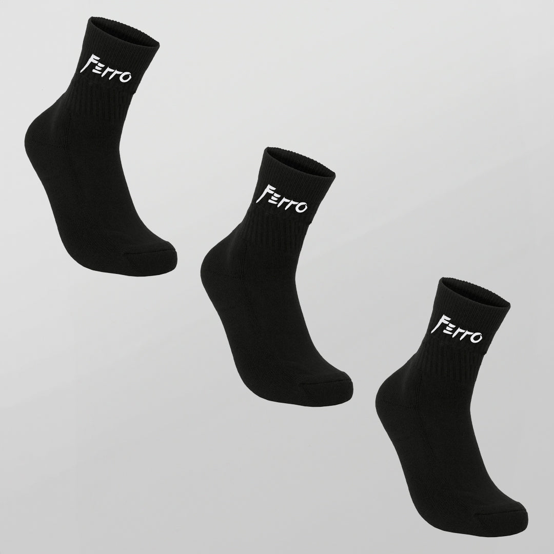 White crew cut socks with Ferro logo on the top. Packaged with a black cardboard sleeve with the winged Ferro logo.