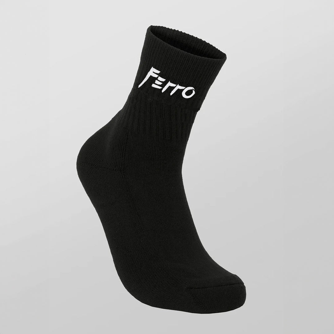 White crew cut socks with Ferro logo on the top. Packaged with a black cardboard sleeve with the winged Ferro logo.